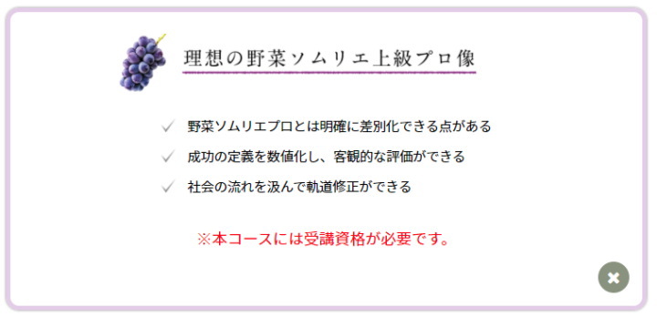 上級の「シニア野菜ソムリエ」は、食に関連する全ての要素(料理・健康・店舗・農業)の知識を習得する必要があります。ビジネスなどで幅広く役立てることが目的と言われています。